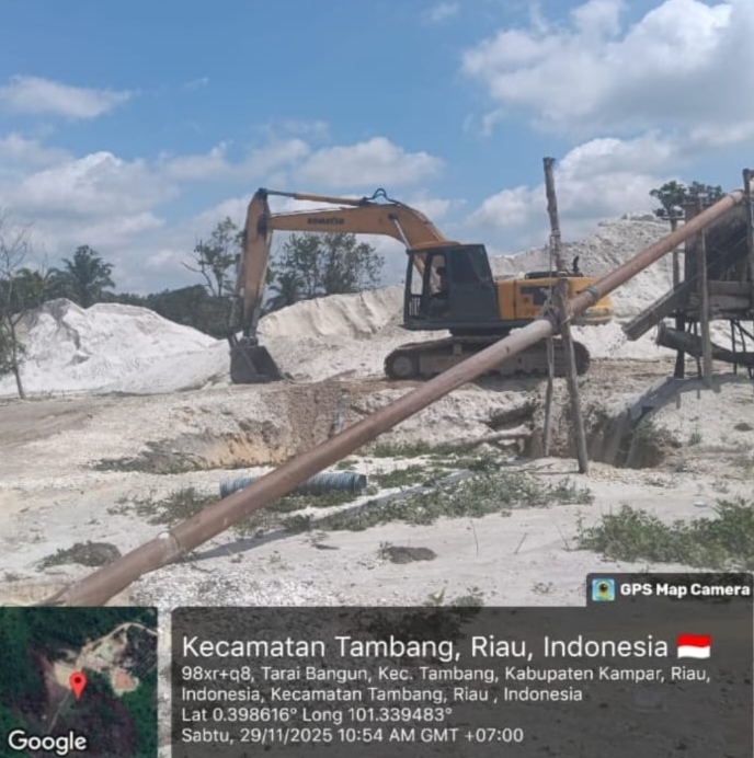 Kampar, Riau — Aktivitas galian C di Jalan Bupati, Desa Taraibagun, Kecamatan Tambang, Kabupaten Kampar, menjadi sorotan publik setelah diduga tetap beroperasi meski disebut-sebut tidak mengantongi izin resmi.