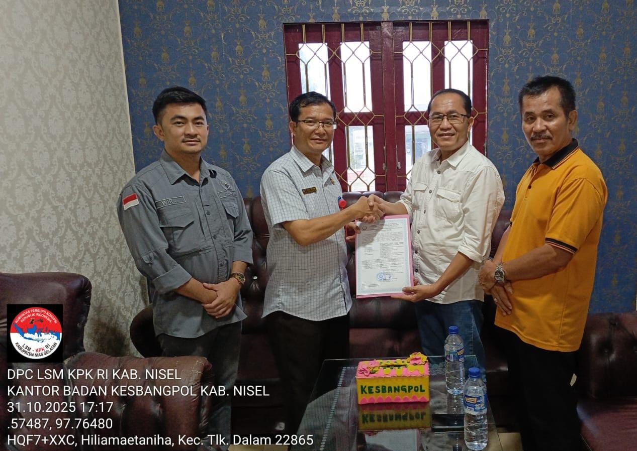 Nias Selatan, 31 Oktober 2025 – Dewan Pengurus Cabang Lembaga Swadaya Masyarakat Komunitas Pemburu Republik Indonesia (DPC LSM KPK RI) Kabupaten Nias Selatan secara resmi menerima Surat Keterangan Terdaftar (SKT) dari Badan Kesatuan Bangsa dan Politik (Kesbangpol) Kabupaten Nias Selatan, Provinsi Sumatera Utara.
