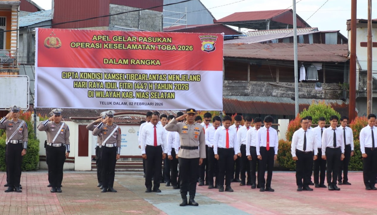 Nias Selatan ( Publik.news ) – Polres Nias Selatan melaksanakan Apel Gelar Pasukan Operasi Keselamatan Toba 2026 sebagai wujud kesiapan penuh dalam mendukung pelaksanaan operasi kepolisian bidang lalu lintas di wilayah hukum Polres Nias Selatan. Apel tersebut digelar di halaman Mako Polres Nias Selatan, Jalan Mohammad Hatta Nomor 2, Kecamatan Teluk Dalam, Kabupaten Nias Selatan, Senin (02/02/2026).
